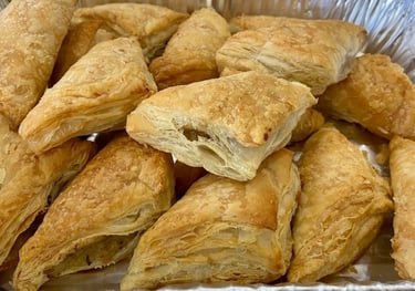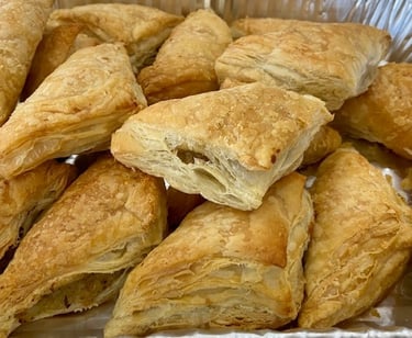 A Potato Puff is a pastry filled with a spicy and savory potato mixture. The outer layer is typically made from flaky puff pastry, which encases a rich filling of seasoned mashed potatoes.