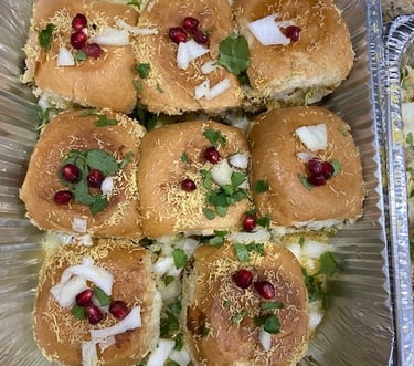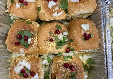 Dabeli is a spiced potato mixture sandwiched between a bun (pav) and garnished with a variety of toppings.